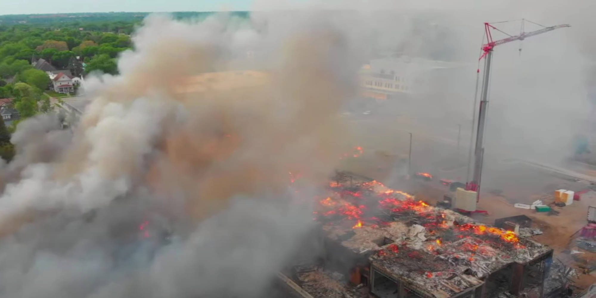 Another video from the FOX 9 News drone also taken in East Lake Street the morning after the protests began shows a building still fiercely burning with what looks to be a construction site set alight, as well with cops making their way down the street in patrol cars.