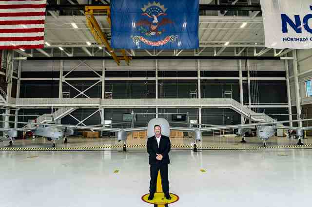Mike Fridolfs, Northrop Grumman’s Grand Sky site director, with the Firebird drone.